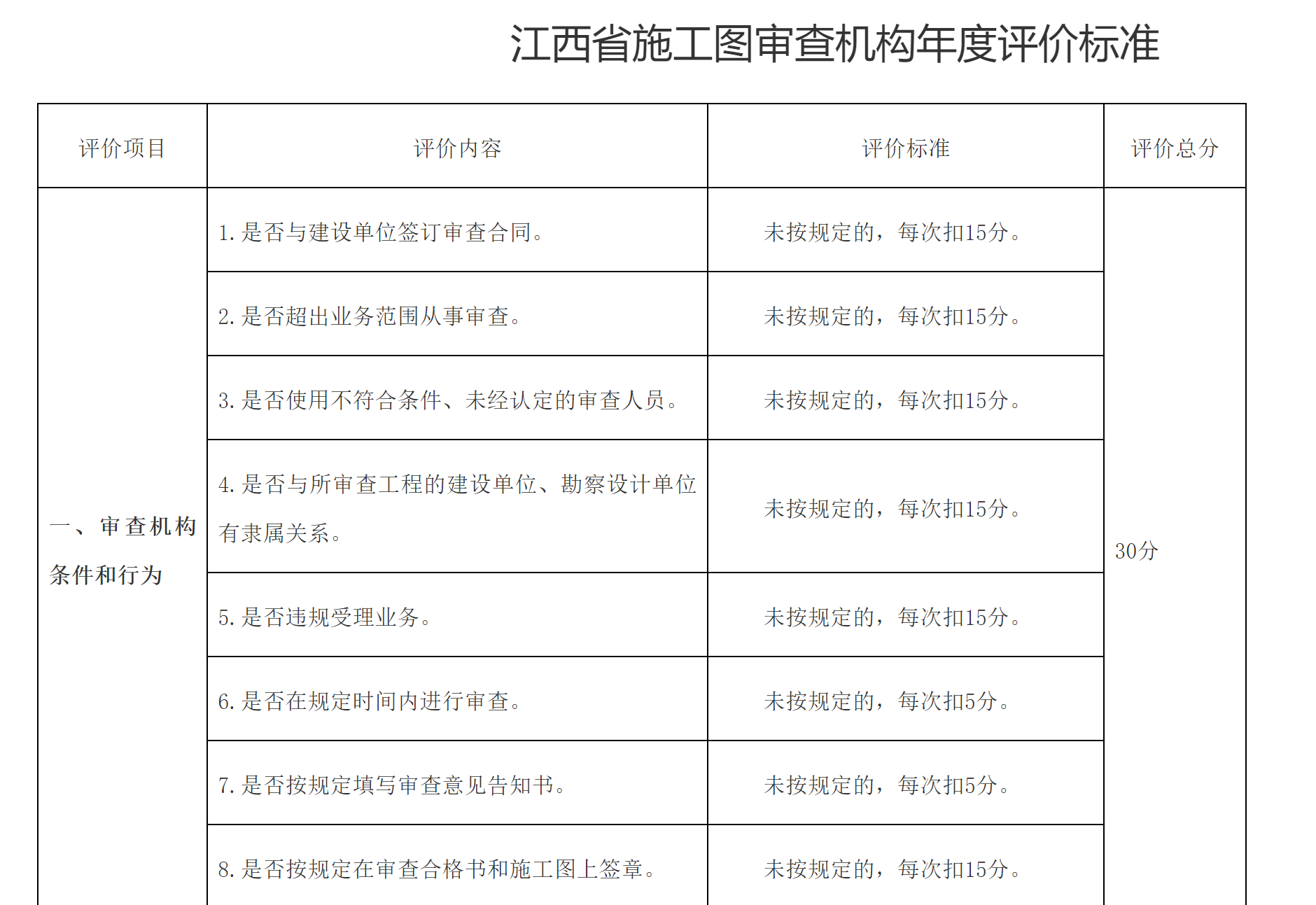 第二十四条本省实施审查机构年度评价制度。省住房城乡建设厅依据评价标准实施审查机构年度评价(评价标准见附件),根据评价结果完善审查机构、审查人员的监督管理。年度评价得分低于60分的,约谈审查机构负责人并责令限期改正,同时核查其是否符合审查机构规定条件。